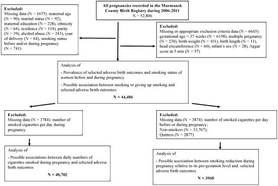 A total of 52,806 pregnancies were registered in the MCBR from 1 January 2006 to 31 December 2011. For the purpose of this study, we excluded women if they had delivered before 37 completed weeks of gestation or had a multiple pregnancy. Our study focused on three main tobacco-smoking issues related to pregnancy: (i) smoking status; (ii) number of cigarettes smoked daily; and (iii) smoking reduction compared to its pre-gestation frequency. Sampling details and missing data are summarized in Figure 1. The exclusion criteria indicated in this figure are as adopted previously [].