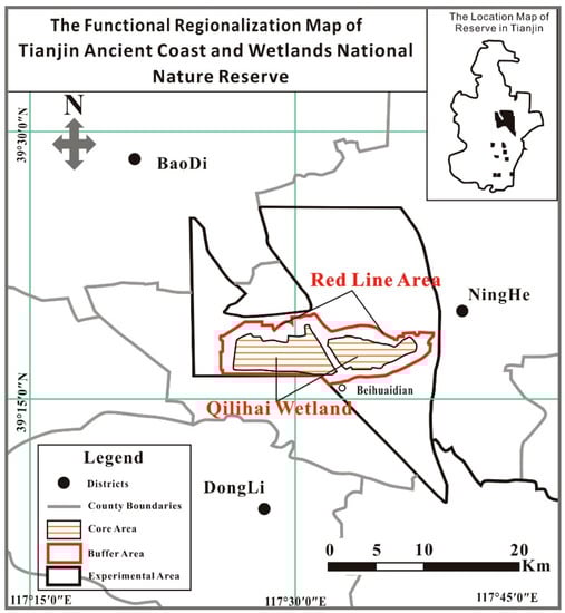 The Tianjin Ancient Coast and Wetlands National Nature Reserve (referred to as the Tianjin National Natural Reserve) is in the west bank of the Bohai Bay, in eastern Tianjin, China, which includes the districts of Ninghe and Jinnan, and part of the Binhai New Area. In 1992, the Tianjin Reserve was approved as a national nature reserve, representing the only national marine nature reserve with the mission of protecting and managing the natural environment and ecosystems, particularly the shell embankment, oyster reef of rare ancient coastal relics and wetlands areas. Tianjin National Natural Reserve belongs to a discontinuous, open protected reserve with an area of 359.13 km2, including the core area of 45.15 km2, a buffer area of 43.34 km2 and an experimental area of 270.64 km2. The Tianjin National Natural Reserve contains abundant natural resources, especially in the core area, with the functional regionalization of the Tianjin National Natural Reserve shown in Figure 1.