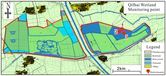 The map of monitoring sites in the Qilihai Wetland. Numbers 1, 2 and 3 refer to the monitoring points.