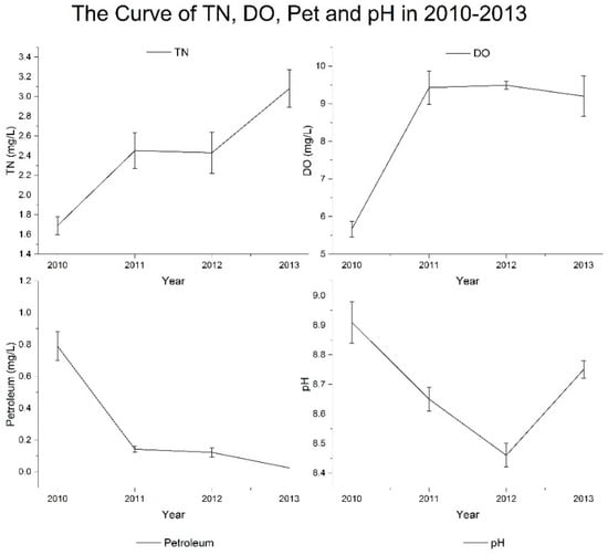 The average concentration curves of the indices total nitrogen (TN), dissolved oxygen (DO), petroleum (Pet) and pH between 2010 and 2013.
