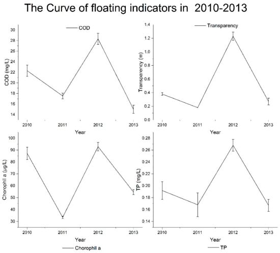 In the analysis, we identified significant variation in some indicators during the monitoring period, including the indicators TP, COD, Chlorophyll a and transparency (Figure 4). An unstable water quality environment can result in the outbreak of water pollution incidents, for example, the concentration of TP in 2012 was 0.268 mg/L, higher than the years 2010 and 2011 by 39.6% and 59.5%, respectively, with neither of these years meeting the water quality standards for TP concentrations.