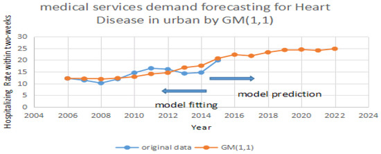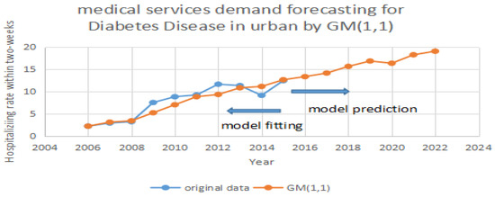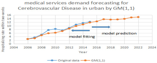The GM (1,1) prediction model was created by Deng (1989), who is the founder of Grey system theory [32]. Many studies in prediction are based on small datasets [33]. Compared with general statistic models, the models based on Grey system theory such as GM (1,1) only need limited data for building and predicting, which could also provide a certain degree of fitting effect to evaluate the reliability [34,35]. Chen (2012) used the Grey GM (1,1) model to predict demand of doctors and beds in Tianjin in 2013–2018 [36]. Xiang (2015) used a multi-factors Grey prediction model for health technical personnel demand forecasting. The prediction accuracy was shown to be better than that of the auto regressive model [37]. Bao (2015) applied GM (1,1) model to predict the disease burden of the aged population in China [38]. Wang (2014) used the GM (1,1) model to predict ischemic heart disease hospitalizations in Shenzhen, China [39].