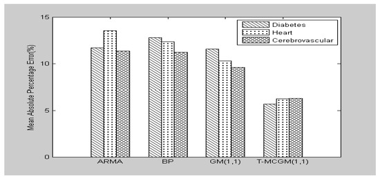 As shown in Figure 7 and Table 2, T-MCGM (1,1) has the highest imitation with the original data. Comparing with the traditional GM (1,1) model, T–MCGM (1,1) has reduced 50.95% in MAPE for diabetes. Comparing with BP and ARMA, T-MCGM (1,1) has decreased 55.68% and 51.54% in MAPE for diabetes, respectively. These results are able to prove the feasibility of T-MCGM (1,1) in our study, which has a better prediction on medical services demands than the other three models.
