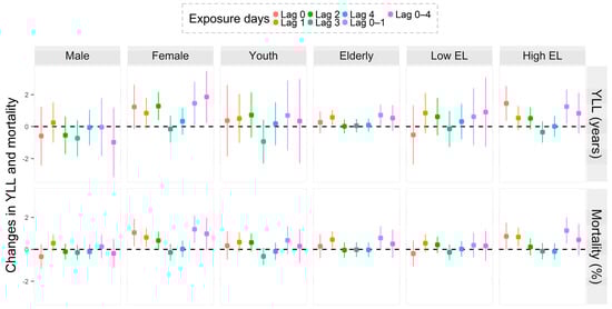 The estimated effects of DTR on subgroup-specific mortality and YLL at different exposure days. The results were presented as changes in daily mortality (%) and YLL (years) associated with a 1 °C increase in DTR. Youth: 0–74 years old; Elderly: 75+ years old; Low EL: 0–6 years’ education level; High EL: 7+ years’ education level.