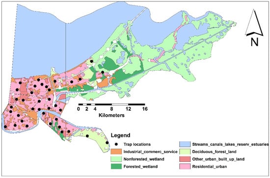 Streams, canals, lakes, reservoirs and estuaries of different sizes (> and ≤1 km) were also included to represent permanent water bodies, as possible breeding sites for Cx. quinquefasciatus. All LULC data layers were imported from a US Geological Survey (USGS) data set. These data were built during the 1970s and 1980s and updated and released during 2007 []. For comparison and confirmation of the USGS data, areas of LULC from zoning district data layers were imported from the City of New Orleans Enterprise GIS Database during 2016.