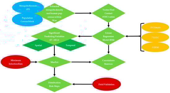 A total of 33 bioclimatic, LULC, socioeconomic and DEM data layers (Table 1) were clipped to NOLA and extracted within each 5-km buffer radii around mosquito sampling sites in preparation for collinearity analysis to: (i) reduce redundancy between influential factors, and (ii) select the significant explanatory variables to be included in MaxEnt (Figure 2) [,]. In this regard, a stepwise linear regression model (RM) was carried out for three purposes: (i) to test the spatial dependency of vector-host contact ratios on their predicting variables within the flight range radii of this mosquito vector around their sampling sites, (ii) to characterize monthly resilience of Cx. quinquefasciatus to their predicting variables, (iii) to overcome redundancy and exclude the linearly correlated variables. This analysis was carried out using JMP pro statistical package ver. 10.0.0 []. The minimum corrected Akaik Information Criterion (AICc) and R2 values were used to select the significant predicting variables (p < 0.05) [,,,,].