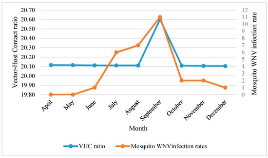 The temporal distribution of WNV mosquito vector showed ecological resilience in terms of month-to-month response to their predicting variables. This resilience was demonstrated as the temporal changes of predicting variables and did not affect monthly vector-host contact ratios (20.16 ± 0.02) (Figure 3).
