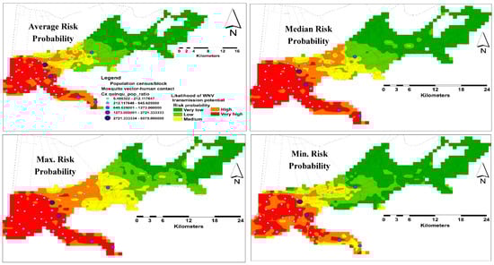 Distribution risk maps for WNV in NOLA representing average, median, maximum, and minimum habitat suitability and sampling localities.