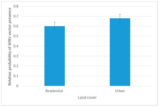 In the spatial analysis, the RM demonstrated a significant association between NFWL and VHC ratios (R2 = 82, p < 0.01). The NFWL habitats were dominant in the eastern side of the city with significantly low human population census. Although this side has not been extensively sampled (No. traps = 1), it is worthy to be highlighted in further investigations to understand the temporal association between WNV vector and reservoir host(s). Other LULC related variables such as TD, OUBL and RU showed a reduced contribution in predicting the likelihood of VHC. These LULC habitats provide both sugar and blood meals, and are favorable to WNV maintenance by enhancing maintenance and amplification phases between mosquito vector and their nesting/roosting reservoir bird hosts, especially the passerines []. This finding was confirmed by the selective feeding preference of this mosquito vector in NOLA, their contribution in both enzootic and epidemic transmission cycle of WNV [,,,,,], and the extended transmission season due to the milder climatic conditions of the Gulf Coast as manifested in mosquito WNV infection rates (Figure 3). Similar reports of increases in mosquito WNV infection rates have been made in 2005 and 2006 in Chicago []. Moreover, both the Jackknife test in MaxEnt (28.9%) and temporal analysis emphasized the association between LULC types during amplification and early transmission phases (May–August) (Table 3 and Table 5).