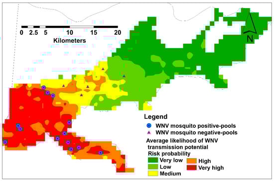 A total of 715 mosquito pools were tested for WNV representing 18 collection sites. Only 30 mosquito pools were WNV positive during June–December, confirming our results in the temporal analysis. Thirteen and five collection sites were recorded as WNV positive and negative, respectively, representing different habitat suitability classes (Figure 6).