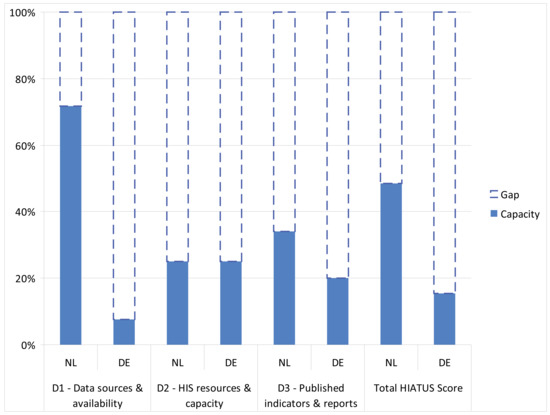 In the consensus-based rating, the total HIATUS score was 47 in NL and 15 in DE, translating into a relative within-country gap in HIS capacity of 52% (NL) and 85% (DE) respectively (Figure 1).