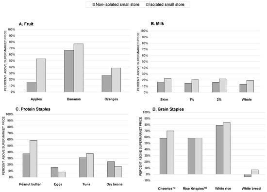 Figure 1 presents the price differentials between smaller stores and supermarkets, according to smaller store isolation status. For all items except eggs, dry beans, and Rice KrispiesTM, the direction of these comparisons was the same, reflecting greater price differences in isolated stores than non-isolated stores. However, apples were the only item for which the price differential was statistically significantly greater in isolated stores compared with non-isolated stores (p = 0.01).