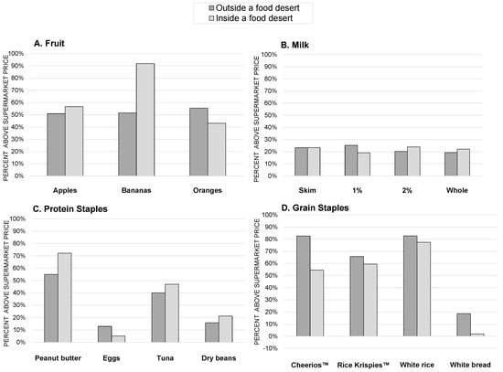 While the presence of food deserts across the U.S. has been well established, few studies have examined potential differences in food prices in various food retail spaces []. This is important to understand, as pricing differences influence food purchasing decisions [,,]. In general, supermarkets obtain food at wholesale prices and have more efficient economies of scale than smaller food stores, resulting in lower prices [,,]. In a recent national study, Rimkus et al. examined milk prices across a number of store types and found prices were significantly lower at supermarkets than at limited service stores []. Nevertheless, price variability for the same product does not always follow expected patterns [,], as several studies have demonstrated lower prices for fresh foods at small food stores than at supermarkets [,,]. If food deserts lack supermarkets, residents of food deserts might face higher prices simply because of the types of stores available in low-income neighborhood.