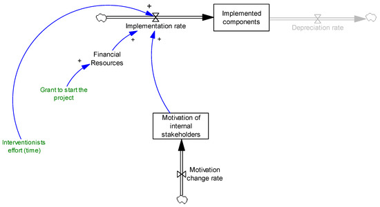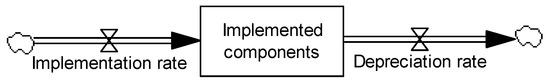 We used system dynamics modeling to develop the causal loop diagram based on interview data. Causal loop diagram is a potential tool to understand the complexity of a system—increasingly used in public health in general and obesity literature in particular [39,40,41,42,43,44,45,46,47,48,49]. Similar to any project, an intervention includes several components that need to be implemented. However, not all implemented components are sustainable, and they may deteriorate over time. We assume that the intervention components are effective, in the sense that if properly implemented and maintained, they have a positive health impact. Therefore, it is the role of adoption, implementation and maintenance to make the intervention successful and sustainable. Stock and flow variables are key tools in system dynamics to present this mechanism. A stock presents accumulations (e.g., the number of implemented components). A flow presents the rate at which the stock changes (e.g., implementation rate is an “in-flow” and depreciation rate is an “out-flow” for the stock of implemented components). Figure 1 simply shows the basic stock and flow of the implemented components.