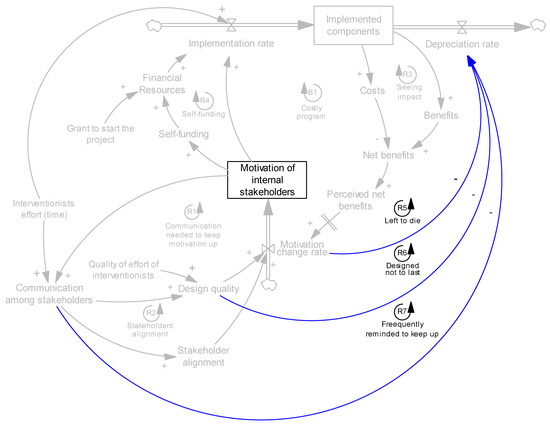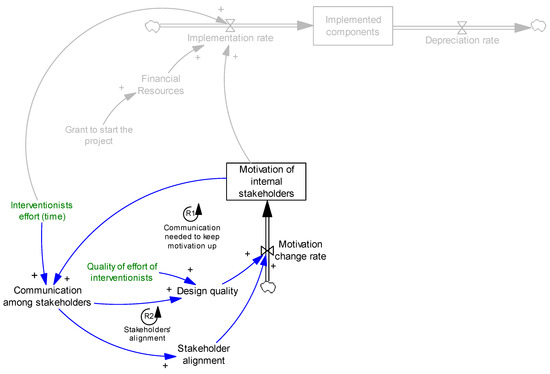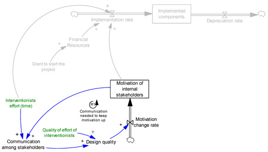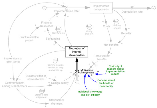 It should be noted that we focus on motivation of internal stakeholders and assume that external stakeholders stay motivated. In fact, we observed highly motivated interventionists. However, we acknowledge that in other settings external stakeholders might become less motivated about the intervention over time. For the sake of simplicity, we only discuss the motivation of internal stakeholders in the model.