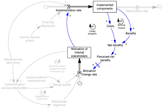 While high motivation reinforces several dynamic mechanisms in the model that lead to better implementation and eventually better maintenance of the intervention, low motivation can act in the opposite manner. Stakeholders who are not motivated might not communicate with the interventionists as often as needed, causing them to face more challenges along the way to implementation, which eventually decreases their motivation. Consequently, reduction in financial and leadership support for implementation results in not fully or properly implementing the intervention components. Internal stakeholders then perceive the program as a whole as not beneficial, and such negative perceptions of the program feeds back to their motivation and makes the situation even worse. This was the situation in hospital N2. The director of the intervention at hospital N2 answers to the question, “Why did the hospital decide to join the program at the beginning”: