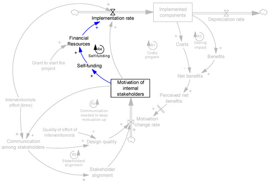 Data analysis began with coding the interviews for common themes related to implementation and maintenance of the interventions [36], following standards for qualitative research [37]. Coding of interviews was conducted by the two authors; any disagreements or concerns about the extracted data were discussed until consensus was reached. Coding helped in learning the mechanisms of implementation and maintenance through identifying key variables and relationships among the variables. For example, “financial benefits” (earned from implemented components) and “motivation of internal stakeholders to implement” are two variables extracted from the interviews, and the relationship between these two variables was that “financial benefits” had a positive effect on “motivation of internal stakeholders to implement”. More variables and mechanisms that have an impact on implementation and maintenance are discussed in the following sections. The emerging relationships among the extracted variables were then integrated into an evolving causal loop diagram [38]. The resulting causal loop diagrams embedded the key relevant mechanisms important for understanding how the interventions were implemented and how they eroded.