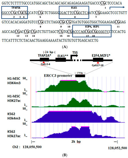 (A) The CpG dinucleotides contained TFBSs in the investigated sequence for methylation of ERCC3 promoterregion. (B) The TFBSs and enrichment of H3K4me3 and H3K27ac modification in ERCC3 promoter region in human embryonic stem cells (hESC) (Green area) and in K562 cells (Blue area). Red triangle indicated CpG unit. * TFBSs by JASPAR CORE Database (http://jaspar.genereg.net/). ** HMR Conserved TFBSs by Transfac Matrix Database (v.7.0) (https://genome.ucsc.edu/). TFAP2A: transcription factors activating enhancer binding protein 2 alpha, MZF1: myeloid zinc finger-1, TSS: transcriptional start site, TFBSs: transcription factor binding sites.
