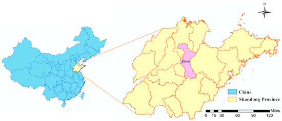 Zibo is a central city in the Shandong Province of China, located between latitude 35°55′ N and 37°17′ N, and longitude 117°32′ E and 118°31′ E (Figure 1). The city consists of nine counties with about 4.53 million permanent residents, according to a demographic census in 2010, and a total land area of 5965 square kilometers, which covers nearly 3.8% of Shandong’s entire area. Zibo City has developed into an important modern industrial city with steady population growth.
