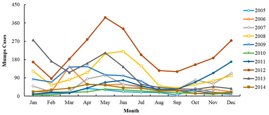 Monthly mumps cases from 2005 to 2014 in Zibo City.
