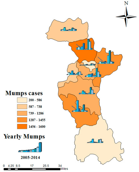 During this study (2005–2014), a total of 8722 mumps cases were reported in Zibo City, Shandong Province, including 5663 males and 3059 females, and a male-to-female ratio of 1.85:1. Mumps mostly occur within the ages of 0–80 years, while the age group of 1–20 accounted for the 94.05% of all reported cases. The highest percentage of mumps cases is found in students, who account for 65.89% (n = 5747), followed by the kindergarten children and scattered children. The monthly mumps cases are presented in Figure 2. Though mumps occur in every month, they also have obvious periodicity and seasonality, which manifests basically as two epidemic peaks from April to July and October to January, with an emphasis on the former. In addition, the geographical distribution with annual mumps over a full year and two peak seasons from 2005 to 2014 are shown in Figure 3. Serious endemic areas mainly emerge in Huantai County, Linzi District, and Boshan District. Annual mumps cases are mapped by the histograms; the peak year for most areas in Zibo City is 2012, including Huantai county and Linzi District. Furthermore, there is an outbreak in 2008 in Boshan District. The sequence diagram also show the outbreaks of mumps in 2008, 2012, and 2013 (Figure 4).