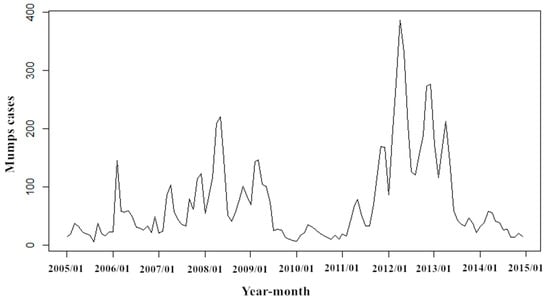 In China, mumps is defined as a notifiable infectious disease. The annual incidence is more than 20/100,000 since 2005; and infection rates reached 30/100,000 in 2011 and 2012 (http://cdc.ncmi.cn/Share/index.jsp). Although some measures aimed at mumps have been applied, including vaccine immunization [1], the epidemic situation remains serious due to gene mutation of the mumps virus and China’s huge and highly mobile population. Outbreaks have been observed in many countries, such as Korea in 2013 [9], the United States in 2006 [10], the Czech Republic [2], the United Kingdom, and Belgium [11]. Mumps is extremely severe disease in the Shandong province, and it has the second highest rate in respiratory infectious diseases and [12]. That is a serious public health concern in Zibo City especially, which had the highest reported incidence of mumps among the 17 cities of Shandong in 2012 [13]. It is necessary to fully understand the regularity of mumps in Zibo City, and then model and forecast the disease to provide the scientific theoretical evidences for its prevention and control. For infectious disease, there are many complex affecting factors. Time series analysis is a method of quantitative analysis without regard to the influence of intricate factors, and it could make a scientific quantitative forecast for the future trends of the disease in accordance with historical data and time variables [14]. The autoregressive integrated moving average (ARIMA) model proposed by Box and Jenkins is a commonly statistical method to forecast time series data. It could circumvent many problems in the traditional regression, such as the difficulty in getting detailed data and grasping the influencing factors of the forecasted objects. The ARIMA model has been increasingly used in epidemiologic research to describe the temporal pattern of many diseases, such as dengue [15], tuberculosis [16,17], malaria [18] and others [19,20,21].