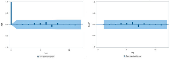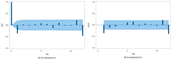 Autocorrelation function (ACF) and partial autocorrelation function (PACF) figures after the logarithmic transformation and difference (the shaded portion is the 95% confidence interval (CI) range).