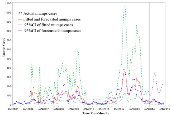 where is the number of reported mumps, is the number of forecasted mumps at time t, and n presents the number of months for forecasting. In the study, monthly mumps cases from 2005 to 2013 are used as a training set for modeling and fitting a SARIMA model, and monthly data in 2014 are used to forecast the mumps as a test set.