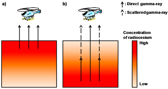 Shortly after the accident, the U.S. Department of Energy and the Japan Ministry of Education, Culture, Sports Science and Technology immediately performed aerial radiation monitoring (ARM) using a manned helicopter to evaluate the distribution of Fukushima-derived radionuclides in the Fukushima Prefecture [2,3]. The temporal variation of the dose rate distribution around FDNPP has been continuously monitored by the Nuclear Regulation Authority in Japan and the Japan Atomic Energy Agency (JAEA) to evaluate the short half-life decay of radionuclides resulting from the decontamination efforts [4]. The analytical schema of ARM using a manned helicopter has been improved in response to geographical and weather conditions [5,6]. ARM using an unmanned helicopter is suitable for small-scale monitoring and evaluation of the local distribution of radionuclides and dose rate above the ground within a narrow area because as per Japanese Aviation Law, a manned helicopter cannot fly at altitudes lower than 150 m. ARM using an unmanned helicopter allows for low-altitude evaluation of the detailed deposition of radionuclides on surface soil. We measured the local dose rate [7,8] and the 134Cs/137Cs ratio [9] within an 80 km2 area around FDNPP using an unmanned helicopter.