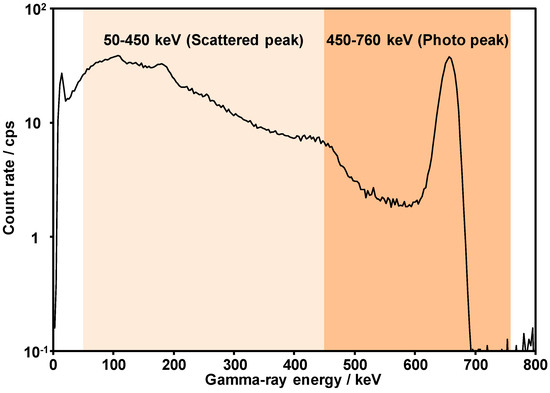 In general, a LaBr3:Ce detector detects direct gamma rays and Compton scattered gamma rays from soil particles. The deeper the radiocesium is located in the soil, the greater the ratio of scattered gamma rays to the detected direct gamma rays. An image of the gamma-ray spectra derived from radiocesium deposited on soil is shown in Figure 3. A conceptual schema of dividing the gamma-ray spectrum obtained from the LaBr3:Ce detector into two sections is shown in Figure 4. The gamma-ray spectra obtained from the LaBr3:Ce detector were divided into two sections at an energy of 450 keV in order to evaluate the radiocesium depth obtained from ARM results. The Compton count rate ratio (RPC) is defined as the ratio of the gamma-ray count rate between 50 and 450 keV (C50–450 keV) to that between 450 and 760 keV (C450–760 keV):