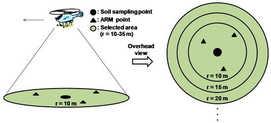 For evaluation of the βeff based on ARM results, RPC which was obtained by some conditions and compared to observed βeff. ARM was performed for the entire study site to evaluate the deposition pattern of radiocesium on the ground. Therefore, the ARM results not only reflect the specific measurement locations but also the surrounding environments, e.g., forests. It is necessary to know the valid range of gamma rays derived from radiocesium on the ground in order to detect the optimum range of the LaBr3:Ce detector placed under the helicopter. We defined a hypothetical circle based on the position of each soil sampling point. The radii of the circles were determined to be at distances of 10, 15, 20, 25, 30, and 35 m from each soil sampling point. RPCs were selected only from the different range circles. A conceptual schema for selecting ARM data is shown in Figure 5. These comparison schemas were applied to flight data of 20 m and 30 m agl. The parameter which can convert from RPC to βeff was determined with the most suitable coefficient correlation. The contour map of βeff based on RPC were calculated and interpolated in 28 m mesh via a Kriging method.