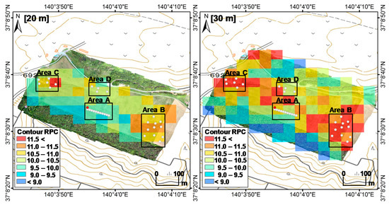 The distribution of the RPC values obtained via ARM at 20 and 30 m agl. is shown in Figure 6. The RPC values are averages calculated within the selected area (50 m × 50 m). The RPC at 20 m agl. was lower than that at 30 m agl. owing to the scattering of gamma rays in the air. The RPC in Area A was lower than that in other areas because inversion tillage had not been performed in this area. In contrast, the RPC in Area B was uniformly high in the farm as a result of inversion tillage. The highest RPC value was observed in Area C owing to non-uniform inversion tillage. The RPC in Area D was relatively low in the parts where inversion tillage had been performed.