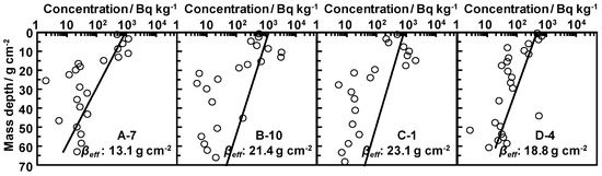 where Am, 0, eff is the effective activity concentration (wet weight) at the ground surface of the soil (Bq kg−1); ζ is the relaxation mass depth (g cm−2); βeff is the effective relaxation mass depth (g cm−2), at which the concentration of radiocesium reduces to 1/e of the concentration at the ground surface; Iγ is the gamma-ray branching ratio; C(ζ) is the conversion factor proposed by Saito [20]; D is the air kerma rate at 1 m above the ground (μSv h−1), calculated using Saito’s conversion factor; z’ is the actual depth from the ground surface (cm); ρ (g cm−3) is the soil density; and Ainv. is the measured deposition (Bq m−2). The soil density ρ was determined based on the mass (wet weight) and the volume of each layer of the soil samples [18].