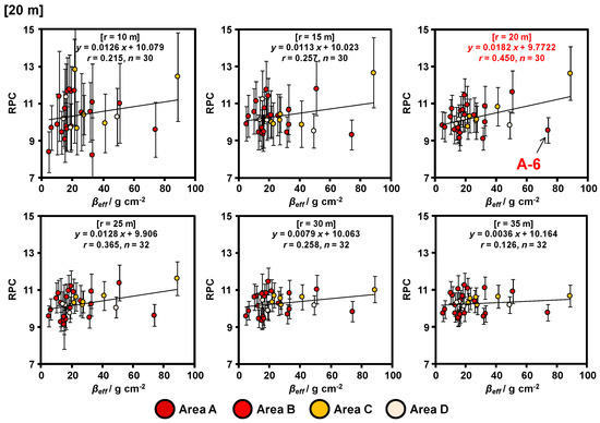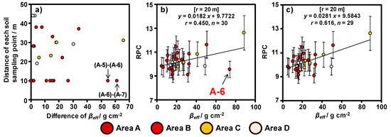 In this section, we evaluate the horizontal spread of radiocesium in the soil based on the relationship between RPC and vertical distribution. An identification schema of irregular data (A-6) based on the distance of each soil sampling point is shown in Figure 10. In Figure 10a, the distance of each soil sampling point was calculated using data obtained from a handheld GPS device, and the difference in the βeff values was calculated by subtracting large βeff from small βeff. In particular, the βeff in A-6 was locally high when compared with adjacent data. On the other hand, the RPC was nearly equivalent to the adjacent data; βeff was 19.5 g cm−2 and the RPC was 10.4 in A-5, and βeff was 13.1 g cm−2 and the RPC was 9.59 in A-7. These results indicate that the RPC was affected both by the ground directly beneath the helicopter as well as by the surrounding environment. In addition, we attempted to remove the locally high βeff in A-6 to confirm our hypothesis. The relationship between βeff and RPC after the removal of irregular data is shown in Figure 10c. Figure 10c shows a good correlation between RPC and βeff. Therefore, our method is suitable for evaluating the vertical distribution of radiocesium in soil over wide areas, with a minimum distance of >20 m between each soil sampling point. In such a case where a locally high βeff was observed owing to non-uniform inversion tillage conducted at narrow intervals of each soil sampling point (<20 m), we need to pay attention regarding the validity of the developed method.