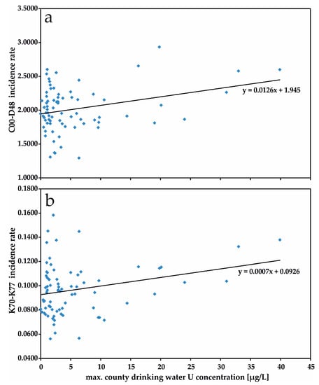 Bivariate correlations of maximum U concentrations in drinking water and diseases groups incidence rates. (a) C00-D48; (b) K70-K77.