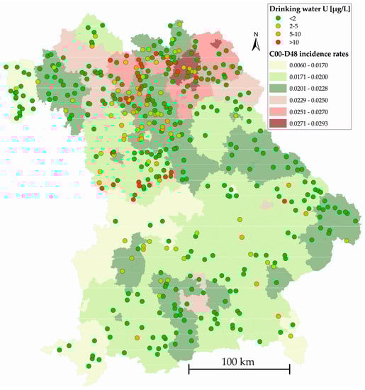 In this study, we collected and analyzed data from the German federal state of Bavaria on drinking water U concentrations and incidence rates of selected groups of diseases potentially associated with elevated U exposure (tumors/growths, liver, thyroid, musculoskeletal and genito-urinary diseases, and congenital malformations). Pearson correlation, odds ratios/relative risk calculation and GIS visualization were used to study potential associations between these parameters.