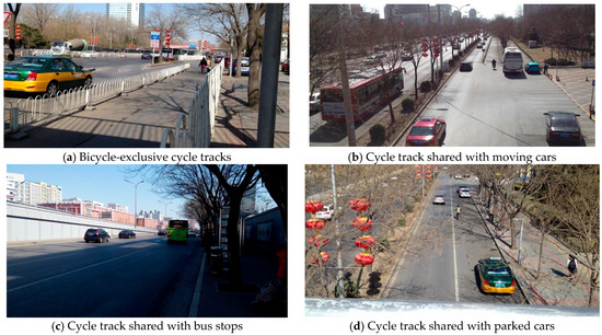 Our study differs from these previous studies because those cycle tracks were bicycle-exclusive, including the cycle tracks in Hangzhou, China. The cycle track transportation networks in China have been in place since 1949 [14,39]. With the introduction of more vehicles, the prestige of owning and driving a car and the crowding of Chinese cities, the wide cycle tracks in China are now also used for moving vehicles, parking cars and waiting for buses. The students in our study disliked having to share the cycle tracks with moving vehicles more than their dislike of sharing with parked cars or bus stops. Many studies in Western countries revealed the hazard of serious crashes from on-street car parking due to visual obstruction and being injured by opening car doors [40,41]. Even if the door of a parallel-parked car opens on a cycle track, there is less likelihood that a moving vehicle will simultaneously be passing by on the cycle track.