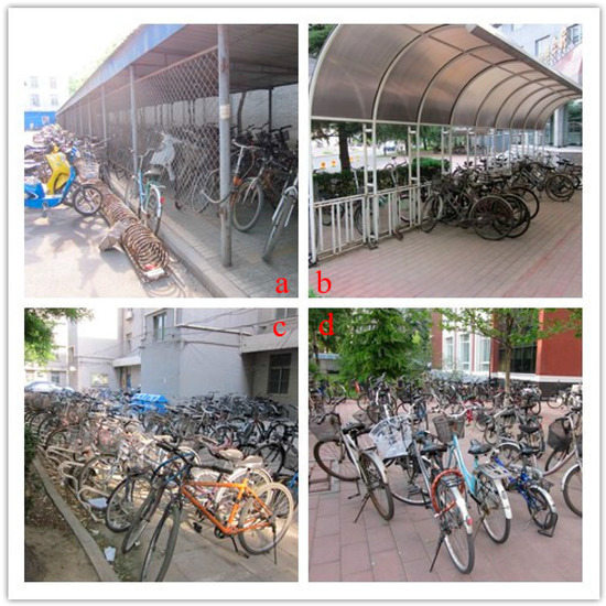 In addition to having a comfortable bicycle route, bicycle parking has been identified as a critical component [22,23,24,25,26,27,28]. The typical bicycle in China includes a kickstand and built-in lock, as found in the Netherlands, but not in the U.S. For college students, this bicycle is appropriate because the customary bicycle parking on Chinese campuses includes wide paved plaza areas where students can randomly park and lock their kickstand-outfitted bicycles. Even though parking in this location is considered secure, Chinese campuses also provide caged sheds which, in some locations, have staff to repair bicycles and provide additional security.