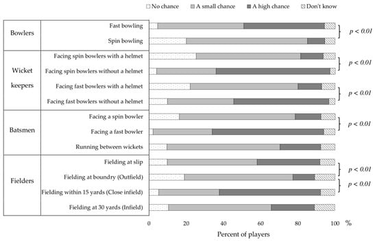 Survey respondents perceived fielding in the outfield as safer than fielding in the infield (i.e., when closer to the batter). Injury risk perceptions associated with wicket-keeping-related tasks were related to both the type of bowler faced with and helmet use. The chance of wicket-keepers getting injured while not wearing a helmet was perceived as “high” when facing a spin-bowler (61.2%) and a fast-bowler (51.1%). When wearing a helmet, wicket-keepers were mainly perceived as having “no chance” (25.4% spin-bowler vs. 22.2% fast-bowler) or a “small chance” (56.1% spin-bowler vs. 57.9% fast-bowler) of injury.