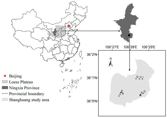 The study was performed at Guyuan Ecological Research Station in the “hilly-gully” region of the Loess Plateau. This station is located in the Shanghuang study area (106°26′–106°30′ E, 35°59′–36°02′ N), Guyuan city, Ningxia autonomous region (Figure 1). The elevation of the study region is 1534–1822 m. The study area has a sub-arid climate. The region is characterized by a mean annual temperature of 6.9 °C, a mean annual precipitation of 419.1 mm, and an aridity index of 1.55–2.00. The soil texture is medium loam. According to the U.S. Soil Taxonomy, the studied soils were classified as Entisols [].
