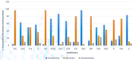 The percentage of antimicrobial resistance profiles of S. aureus isolates. PG = penicillin, GM = gentamicin, VA = vancomycin, T = tetracycline, AP = ampicillin, FOX = cefoxitin, LEV = levofloxacin, CIP = ciprofloxacin, CD = clindamycin, IMI = imipenem, RP = rifampicin, DO = doxycycline, SXT = sulfamethoxazole-trimethoprim, E = erythromycin, OX = oxacillin, C = chloramphenicol.