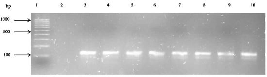 Polymerase chain reaction (PCR) was used for confirmation of S. aureus as previously described []. DNA was extracted using the boiling method where 2 mL of overnight pure Nutrient broth cultures were transferred to sterile eppendorf tubes and centrifuged at 13,000 rpm for 3 min. The supernatant was discarded and cells re-suspended in 200 μL sterile distilled water. The cell solution was then heated at 100 °C in an Accu dri-block (Lasec, SA) for 10 min, followed by centrifugation at 13,000 rpm for 2 min to pellet the cells []. The supernatants were transferred to clean, sterile tubes and used directly as templates for PCR assay or stored at −20 °C for subsequent use.