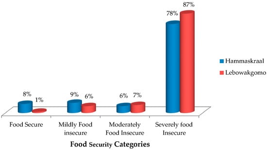 Mothers from both study areas experienced food insecurity access-related conditions. In Hammanskraal, mothers were anxious and uncertain about food supply for their children (68.5%) and fed them inadequately, with respect to both quality (72.9%) and quantity (58.6%) (not tabulated). On the other hand, Lebowakgomo mothers were also anxious and uncertain about food supply for their children (87.2%) and fed them inadequately, in terms of both quality (83.4%) and quantity (70.7%) (not tabulated). Consequently, high levels of food insecurity (access) were observed in both study areas (Figure 1). The decrease in household per capita income and limited utilization of agricultural produce when preparing complementary foods increased the level of anxiety and uncertainty about supply of adequate quality food (p < 0.05) (not tabulated).