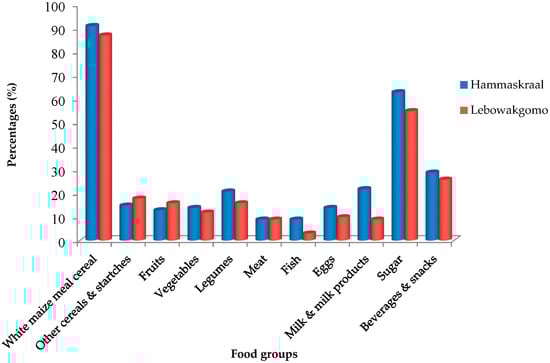 Mothers acknowledged that various food groups were rarely consumed by the children (Table 2). According to the FGDs, the economic access to complementary foods was a major challenge for mothers in both study areas (not tabulated); consequently, the majority of the children had not consumed various food groups in the previous 24 h (Figure 2). Additionally, FGDs revealed that household food baskets in both study areas were composed of energy-rich foods as they were perceived to be more affordable and filling compared to fruits, vegetables, and meat products, which were perceived to be more expensive (not tabulated). Mothers further indicated in the FGDs that, in order to prepare complementary foods, ingredients were sourced from the household’s food basket. Moreover, soft porridge prepared with white maize meal was the most common complementary food given to children during any time of the day; other ingredients such as sugar, milk powder (powdered formula milk or tea whiteners), margarine, or peanut butter were added to white maize soft porridge to ‘enhance taste’. Stiff porridge prepared with white maize meal together with household relish of the day or with diluted liquid milk were usually given to children as supper, and savoury maize snacks, sweets, juice, and tea were consumed in-between the main meals. Poor food consumption patterns could account for the prevalence of underweight in Hammanskraal and Lebowakgomo children, which can be seen from the results in Table 3.