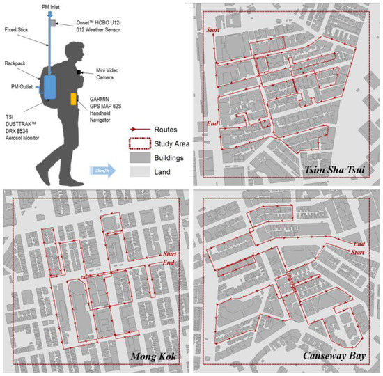 Due to the seasonal variation of the regional weather system, the air pollution condition in Hong Kong is dominated by the regional air pollution (with a higher PM concentration) during the winter time [36]. This regional-dominant pollution mode affects Hong Kong one-third of the time in a year [37]. In this study, the regional-dominant influence of the long-distance transportation of air pollution from the Pearl River Delta (PRD) region of mainland China is out of the study scope. The air quality is dominated by local emission sources during summer time [20,38]. In order to minimize the influence of high background concentration [20], all measurement campaigns were performed under the typical summer weather condition of Hong Kong (no rainfall; partially cloudy [39]; calm or light wind condition [7,40]—a Beaufort wind scale <2 in this study; RH around 85% according to the Hong Kong Observatory [41]). All the three sampling sessions for the three study areas were performed from June to July 2015 (typical summer without extreme weather condition/events). The diurnal pattern of the PM concentration level monitored at the Mong Kok roadside air quality monitoring station of local authority (HKEPD) has been investigated. A considerable increase of PM concentration was observed between 6:00 a.m. and 10:00 a.m. (caused by the surge in traffic of morning commuting). The roadside PM concentration level also has a rapid decline after the evening traffic-intensive hours (in Hong Kong the evening rush hour usually lasts at least until 8:00 p.m. due to the overtime works). Considering above diurnal pattern of roadside PM and also pedestrian activities, all measurement sessions were performed within the time range of 2:00 p.m.–8:00 p.m. (during which the hour-to-hour changing gradient of background PM concentration is smaller than other hours).