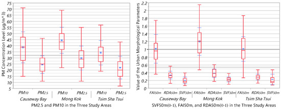 The quantiles box plots (10%, 25%, 50%, 75% and 90%; Mean and Standard Deviation) of PM2.5 and PM10 concentration levels and the three covariates (SVF50m, FAI50m and RDA50m) in the three study areas.