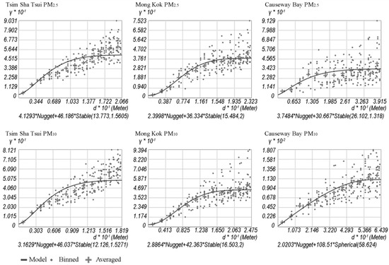 Semivariogram modelling is an essential step for geointerpolation [58]. The bin size selection and the model optimization were determined by taking the advantage of ArcGIS Geostatistical Analyst [59]. This module is able to fit an optimized semivariogram model automatically. Figure 4 shows the six resultant semivariogram models developed for the mapping of the PM2.5 and PM10 spatial variability in the three districts. They were used as the basis of further interpolation. The geostatistical analysis of semivariogram modeling for the three study areas shows that the “Stable” type is the optimal semivariogram model type of almost all resultant models (except the model of PM10 in Causeway Bay which has a “Spherical” model type). The major range of the measured spatial PM2.5 and PM10 data is range from 12 m (PM2.5 in Tsim Sha Tsui) to 58 m (PM10 in Causeway Bay). The average level of the major range is approximately 25 m, which is much smaller than the findings in the previous vehicular mobile monitoring study [60].