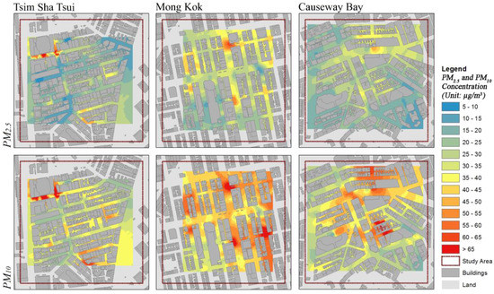 Table 4 shows the results and a comparison of the averaged RMSE and the average of predicted values produced by considering the different weight factors/covariates. The findings by this present study at the microenvironmental scale is different from the conclusion in our previous studies about urban-scale air quality mapping [16,52]. Our previous studies found that the incorporation of urban morphological factors in the geospatial modelling significantly improves the estimation accuracy of the spatial variation of PM concentration at the urban scale. However, it can be observed in this present study that only slight improvements in the interpolation performance were achieved in all three study areas when the fine-scale building geometrical features were considered in the interpolation model (either by using them as weight factors for LPI or as covariates for cokriging). This finding also implies the multiscale properties of the urban outdoor PM exposure in Hong Kong.