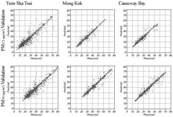 The fine-scale spatial variability of the PM2.5 and PM10 in the three study areas were mapped using the optimal interpolation methods (with the best prediction performance and the minimum RMSE and the highest values). The spatial resolution of the resultant prediction surface of each study area was automatically determined by the algorithm embedded in the ArcGIS Geostatistical Analyst based on the measured data. Therefore, the spatial resolution is slightly different for the three study areas (and they are not the integer as well). The resultant spatial resolution of the prediction surfaces range from 1.4 to 1.7 m. Figure 5 illustrates the geospatial interpolation mapping of the PM2.5 and PM10 concentration in the three study areas. The high PM concentration hotspots can be clearly observed from the mapping results of each of the study areas. The validation results (Figure 6) show that all interpolation mappings of the PM2.5 and PM10 in the three study areas achieved a satisfying prediction performance.
