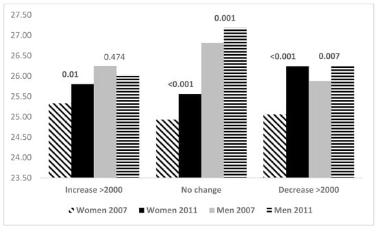 BMI change in the different aerobic step change groups among men and women with p-values, 2007–2011.